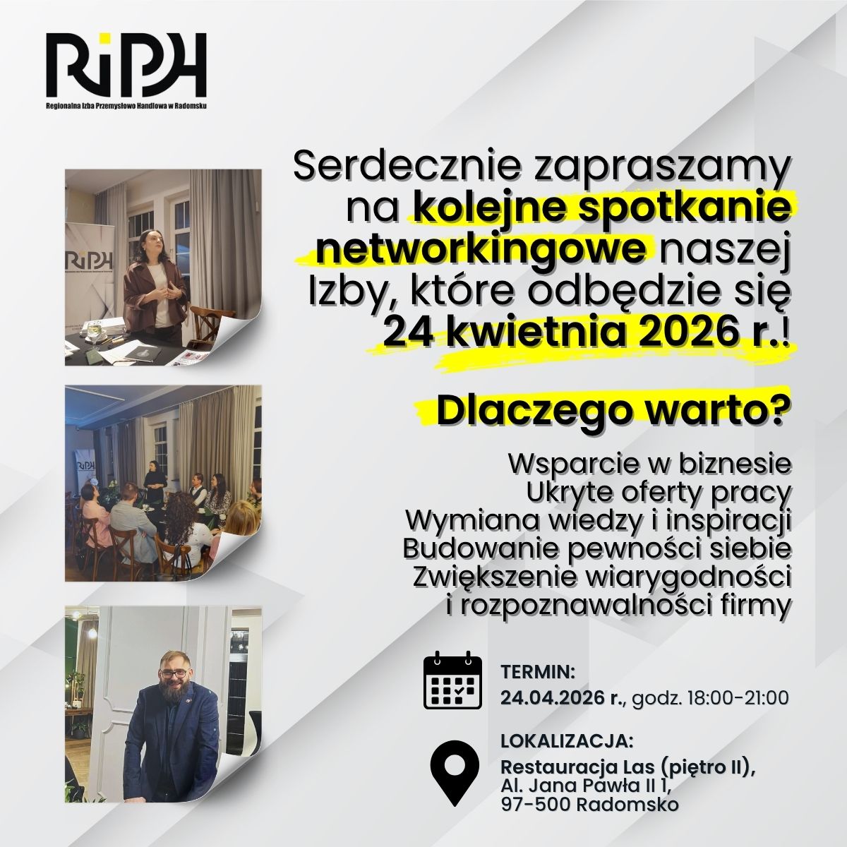 Za chwilę święta wielkanocne… a my już teraz prezentujemy Wam program nadchodzącego networkingu RIPH w Radomsku! Będzie się działo – jak zwykle możecie liczyć na interesujące prelekcje i dobrą zabawę w fantastycznym gronie. Nie zabraknie też fajnych ludzi, którzy prowadzą lokalne biznesy. Spieszcie się! Pierwsze 20 zarejestrowanych