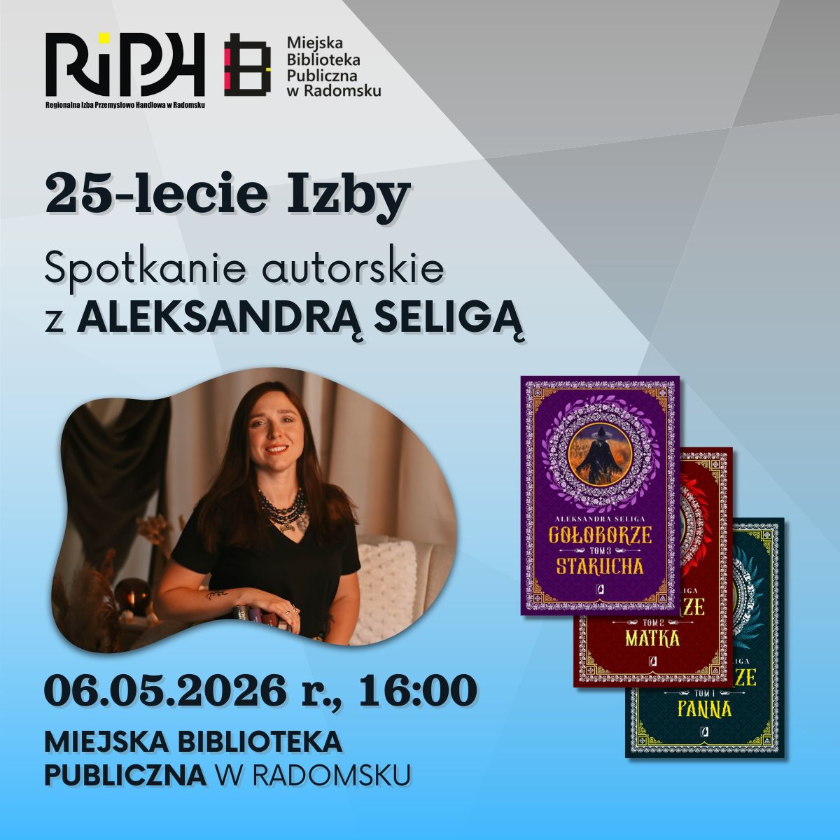 Serdecznie zapraszamy na spotkanie autorskie z ALEKSANDRĄ SELIGĄ, pisarką, dziennikarką, literaturoznawczynią, a także autorką bestsellerowych cykli „Gołoborze” i „Duch Gór”. Wydarzenie to jest częścią serii otwartych i bezpłatnych wydarzeń zaplanowanych na rok 2026, które przygotowaliśmy z myślą o 25-leciu działalności Regionalnej Izby Przemysłowo-Handlowej w Radomsku. Poniżej kilka