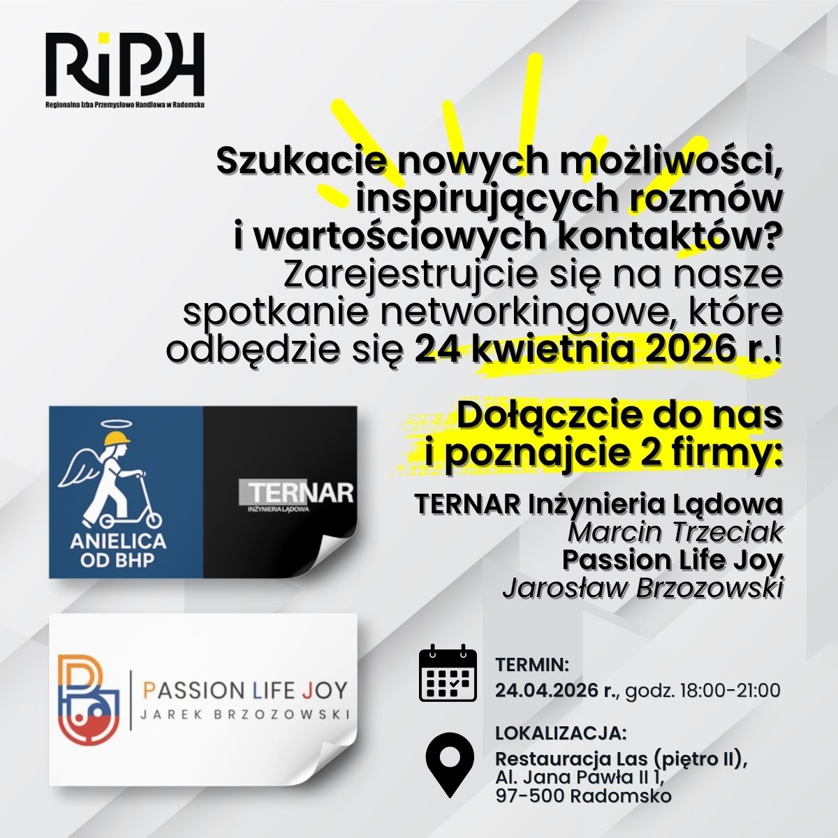 Szukasz nowych kontaktów, inspiracji i możliwości rozwoju? Dołącz do spotkania networkingowego RIPH w Radomsku już w przyszłym tygodniu i… poznaj 2 firmy: Ternar Inżynieria Lądowa Marcin Trzeciak i Jarek Brzozowski Passion Life Joy, które opowiedzą o swojej działalności i ofercie. Dlaczego warto wziąć udział? Podczas spotkania wszyscy