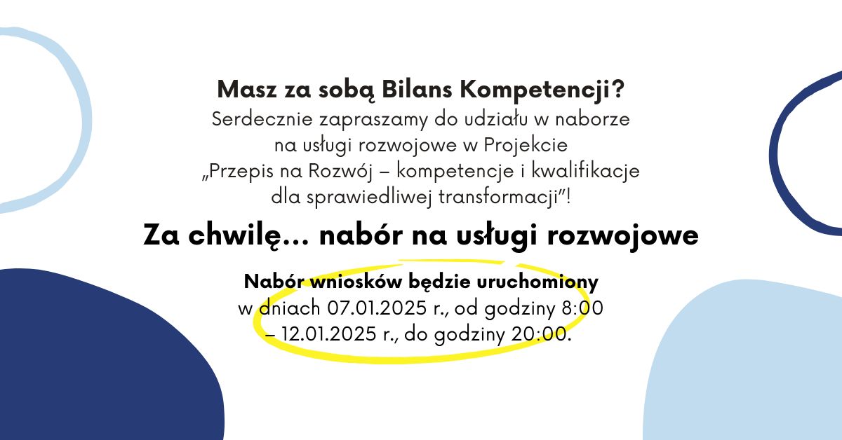Ukończyłeś pozytywnie Bilans Kompetencji? W nowym roku zapraszamy do udziału w II turze naboru na usługi rozwojowe w Projekcie „Przepis na Rozwój – kompetencje i kwalifikacje dla sprawiedliwej transformacji”, który będzie trwać w dniach 07.01.2025 r., od godziny 8:00 – 12.01.2025 r., do godziny 20:00. Nie przegap okazji i przygotuj się na nabór!